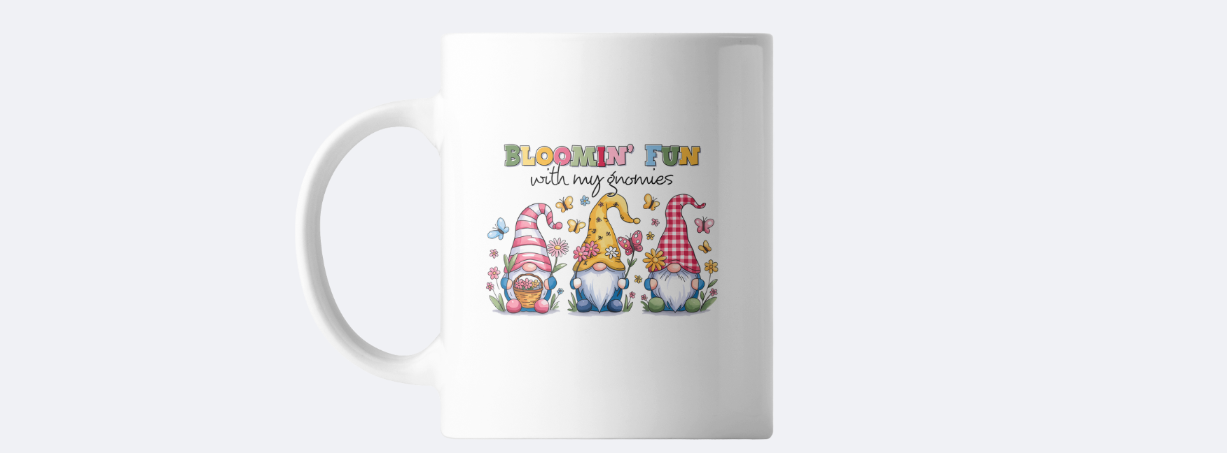 This coffee mug is a fun and playful way to enjoy your morning cup of joe. The design features the text "Blooming fun with my gnomies" in a whimsical font, making it a great conversation starter or a fun addition to a kitchen or office.