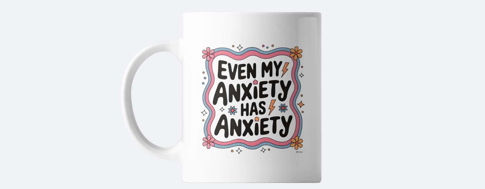 This coffee mug is a unique and humorous way to express anxiety and its effects on the user. The mug features the text "Even my anxiety has anxiety" printed on it, making it a great conversation starter for those who struggle with anxiety.